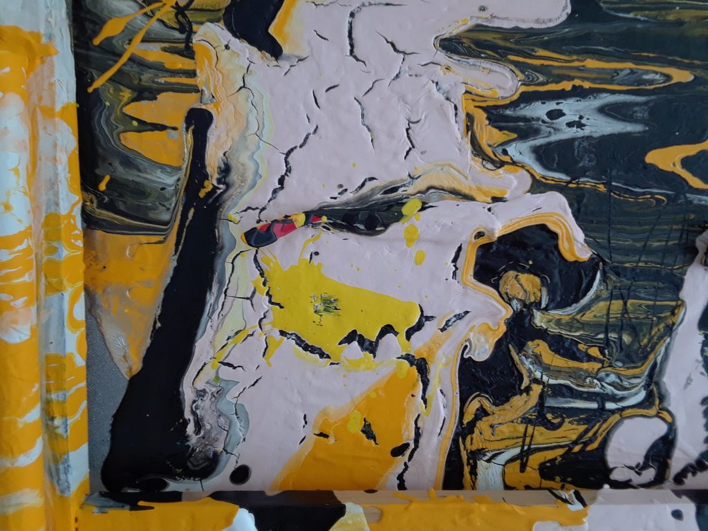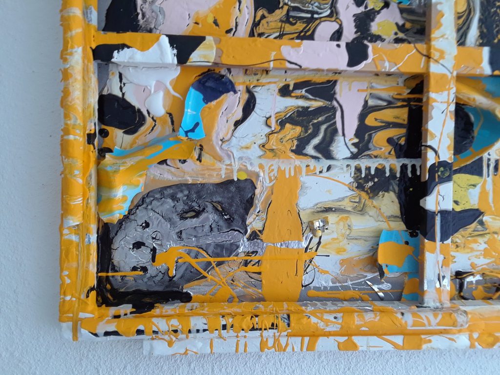Yellow dominates the canvas with reflective silver and gloss black as its companions.